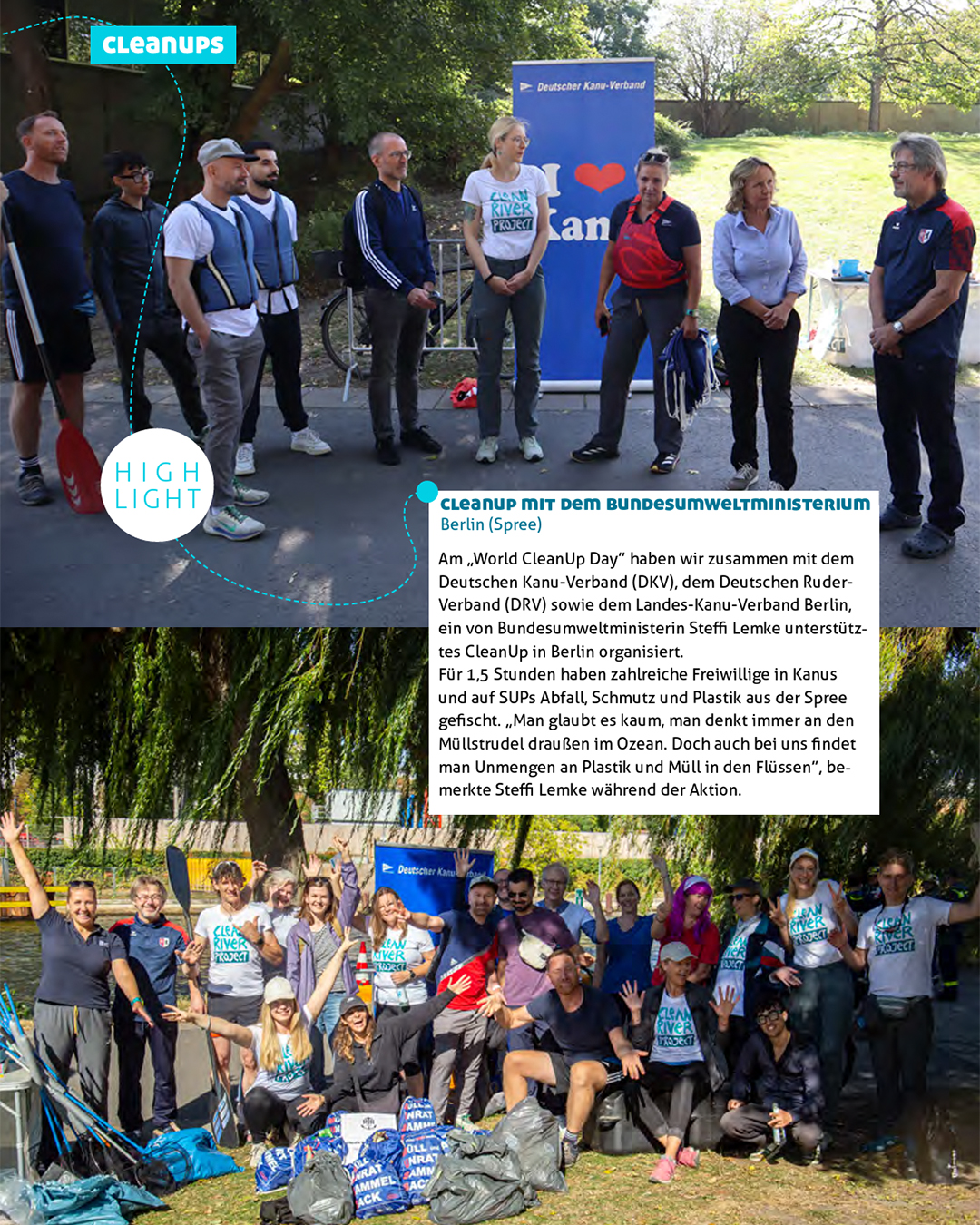 Am World CleanUp Day durften wir ein ganz besonderes Highlight realisieren: Gemeinsam mit dem Deutschen Kanu-Verband (DKV), dem Deutschen Ruder-Verband (DRV) und dem Landes-Kanu-Verband Berlin organisierten wir ein CleanUp auf der Spree – unterstützt von Bundesumweltministerin Steffi Lemke.